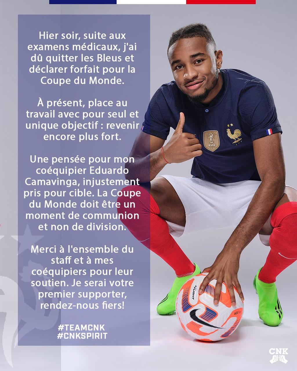 Нападник німецького РБ Лейпциг та національної збірної Франції Крістофер Нкунку за кілька днів до офіційного початку чемпіонату світу-2022 в Катарі зазнав травми коліна під час тренування, яка в підсумку коштувала йому участі в прийдешньому міжнародному форумі.