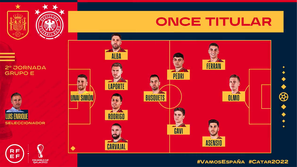 До вашої уваги стартові склади Іспанії та Німеччини на очний поєдинок чемпіонату світу-2022.