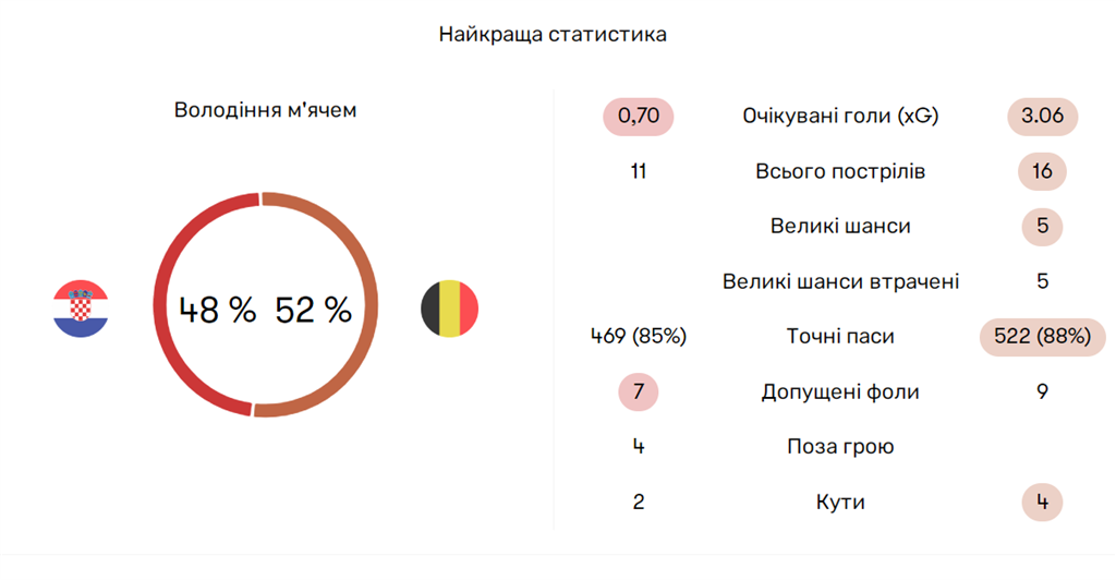 В останньому матчі хорвати мали завдання — вистояти проти Бельгії. Нічия давала право на вихід у плей-оф, і завдання було успішно виконано. Цікаво, що це не була гра тільки на половині поля команди Далича. Вони створювали моменти, хоч голів і не забили, і вибили Бельгію зі змагання.