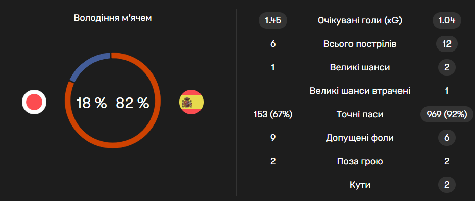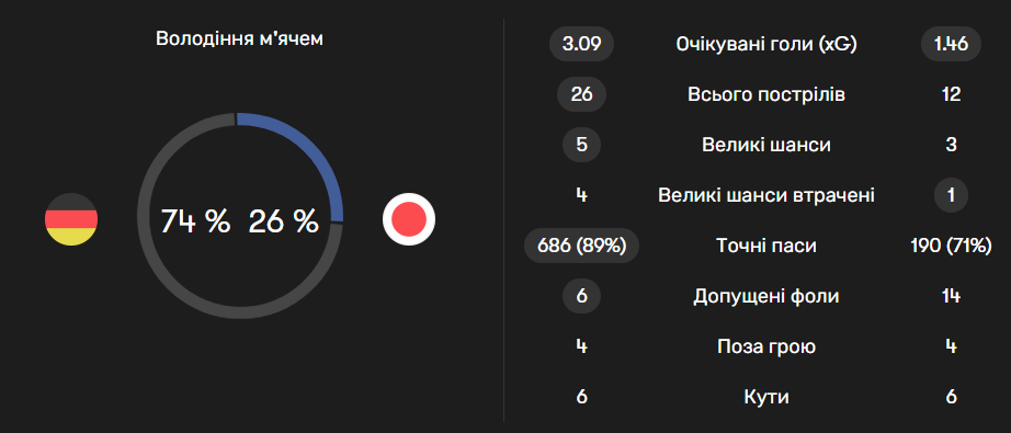 Найкращим матчем японців на груповій стадії стала саме гра проти Іспанії. Азійська команда майже не контролювала м'яч, проте перевершила супротивника за показником XG. Японці пропустили першими від Альваро Морати, але вчергове змогли перевернути хід зустрічі.