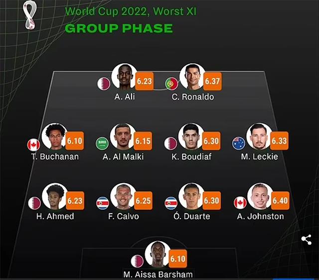 За три гри групової стадії турніру Роналду отримав середню оцінку 6,37 балів. При цьому португалець єдиний представник європейської збірної у команді найгірших.