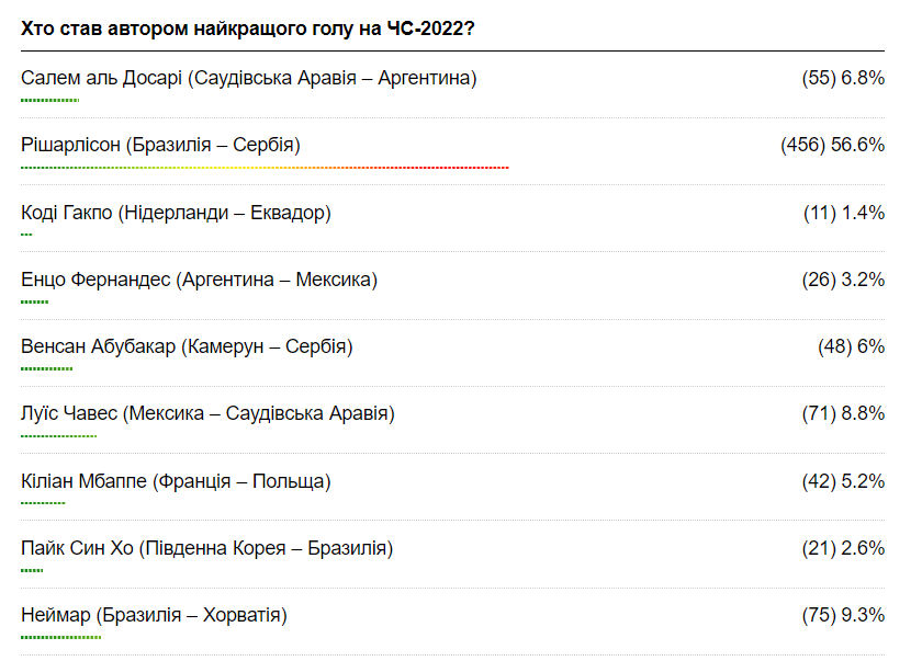 Як повідомляє офіційний Twitter-аккаунт ЧС-2022, переможцем в опитуванні серед уболівальників став гол у виконанні нападника збірної Бразилії Рішарлісона, який бічними ножицями забив у ворота Сербії в рамках першого туру групового етапу.