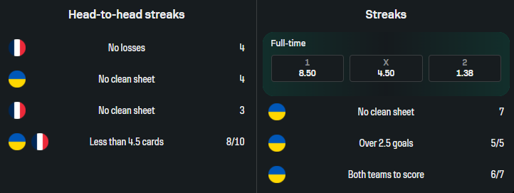 За версією букмекерів, фаворитами майбутнього протистояння є підопічні Дідьє Дешама. Так, на перемогу Франції в основний час пропонується коефіцієнт 1,41, тоді як потенційний успіх України оцінюється показником 8,60. Імовірність нічийного результату представлена коефіцієнтом 4,70.