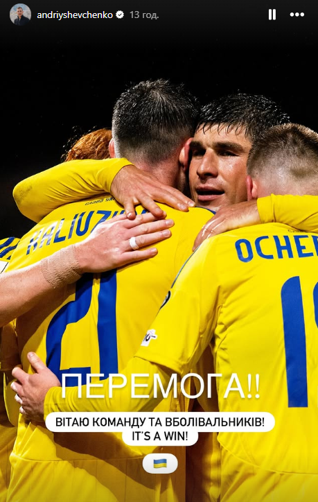 "Вітаю команду та вболівальників. Перемога!" — написав Андрій Шевченко в Instagram.