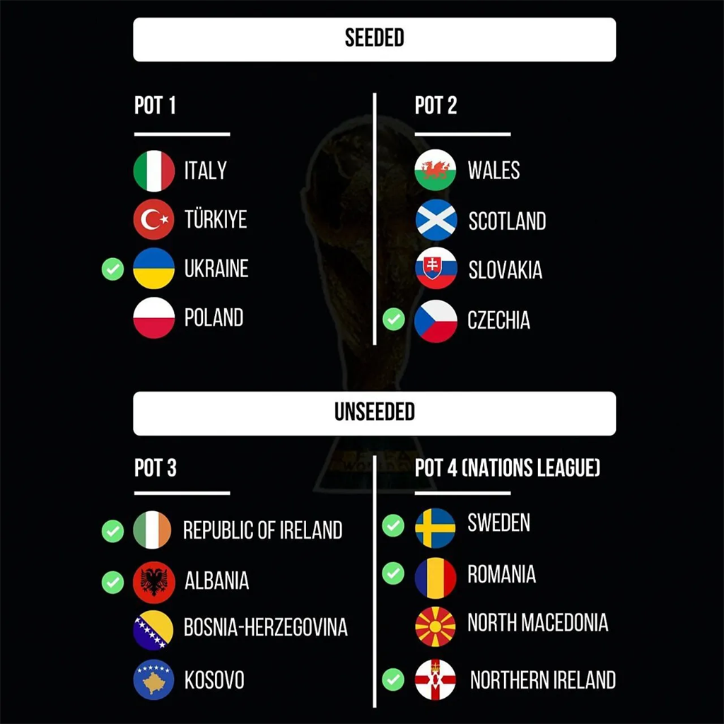 Жеребкування відбудеться 20 листопада, матчі плей-оф — у березні 2026 року. Одна гра в серії, першу з яких Україна проведе вдома в разі потрапляння до першого кошику.