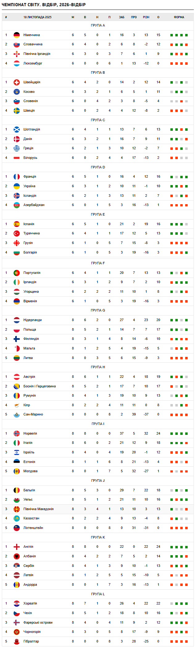 Актуальні турнірні таблиці у європейському відборі до ЧС-2026 доступні за цим посиланням.