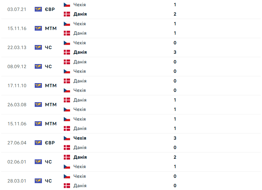 Явно не на боці чехів історія останніх очних зустрічей із данцями. У попередніх десяти матчах Чехія тільки раз святкувала перемогу, майже 22 роки тому. Данія відповіла серією із семи поєдинків без поразок (2В, 5Н). Очікуємо, що атмосфера epet Арени допоможе господарям поля стримати суперника в основний час, але в додатковий гості все ж вирвуть путівку на мундіаль.