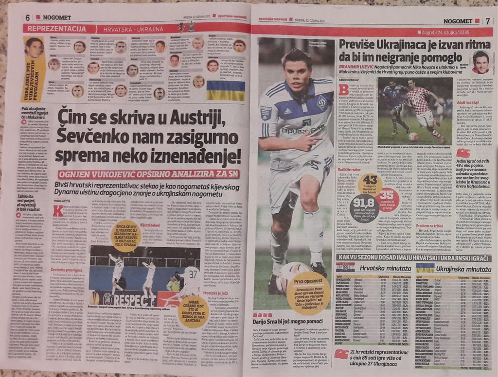 Те, що хорвати фокусуватимуться на Шевченкові, було зрозуміло заздалегідь з тієї кількості заявок на інтерв'ю і спілкування, що їх я отримав. Андрій не пускав іноземні ЗМІ до табору, проте дистанційно ми спорудили кілька ексклюзивів, на багатьох газетах фото Шевченко вийшло на обкладинці. А от з хорватського боку "супер-експертом" з усіх питань щодо України виступив Вукоєвич. Вука заповнював собою цілі розвороти газет, він сміливо робив прогнози на склад і результат, дробив психологічні портрети усіх гравців України, пригадував історії зі старого життя коли жив і виступав у Києві. Приємно бачити і читати, їй-богу!