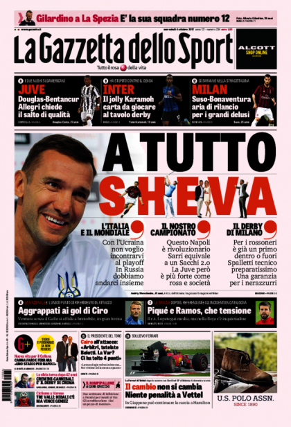 Накануне решающих матчей отборочного турнира ЧМ-2018 тренер украинской сборной Андрей Шевченко ответил на вопросы Gazzetta dello Sport.