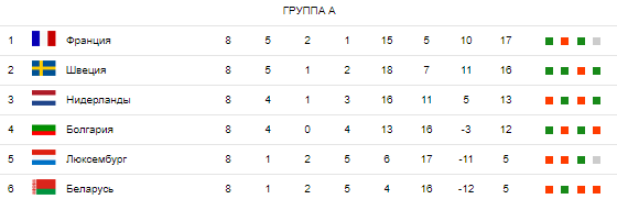 В группе А в девятом туре состоятся матчи Швеция — Люксембург, Беларусь — Нидерланды и Болгария — Франция. Трудно предположить, что лидеры группы потеряют очки. Следовательно, Нидерланды и Болгария потеряют даже теоретические шансы на выход в финальный турнир. Впрочем, после ничьей Франции и Люксембурга в восьмом туре можно ожидать чего угодно.