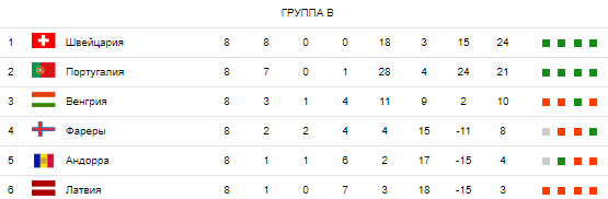 В девятом туре в группе В состоятся матчи Фареры — Латвия, Андорра — Португалия и Швейцария — Венгрия. Если португальцы не наделают глупостей в Андорре, то судьба путевки на ЧМ-2018 решится в очном противостоянии лидеров группы в последнем туре.