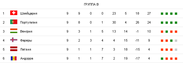 Первое и второе места будут разыграны в очной дуэли между Португалией и Швейцарией, а вот матчи Латвия — Андорра и Венгрия — Фареры интересны лишь потенциальными локальными перемещениями по турнирной таблице между их участниками. Даже возможная смена на последнем месте никак не повлияет на судьбу неудачника борьбы за первое место, поскольку ни Латвия, ни Андорра очков ни у Португалии, ни у Швейцарии не отбирали.