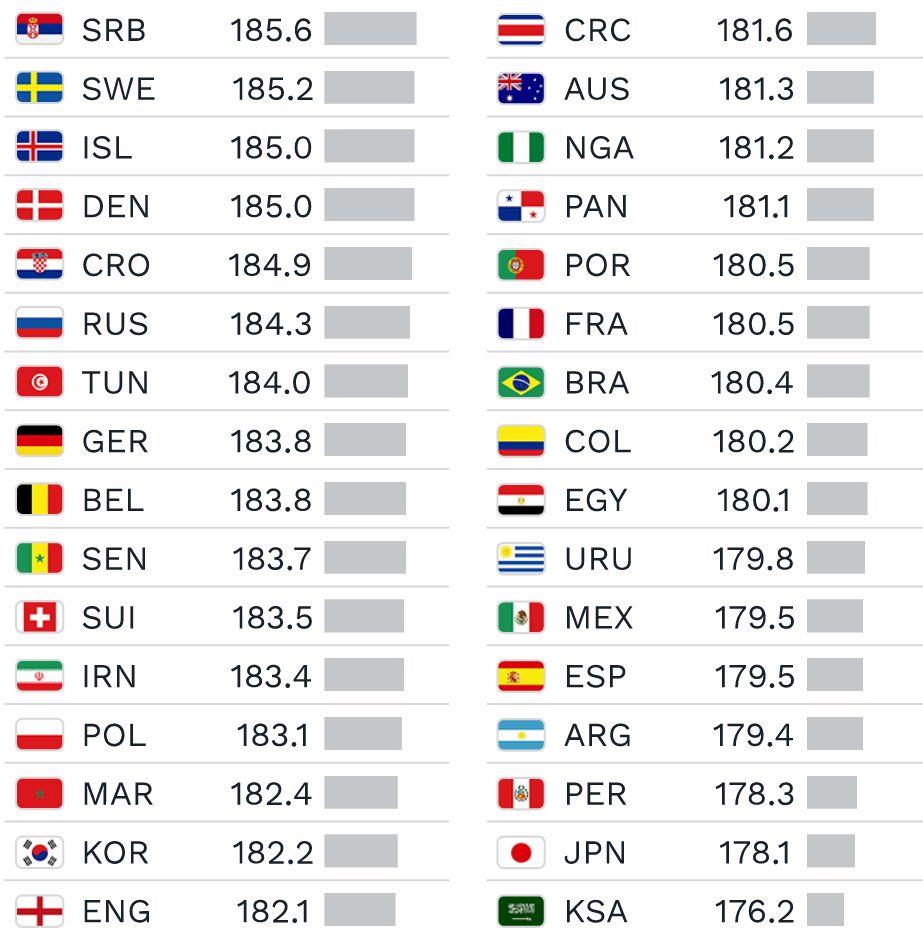 Испания стала единственной европейской сборной, средний рост которой меньше 180 см, но ниже пиренейцев Аргентина, Перу, Япония и Саудовская Аравия. Последние вовсе значительно уступают всем остальным командам.