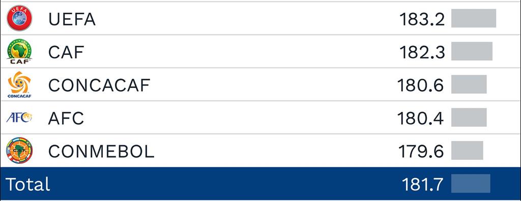 КОНКАКАФ, имея в своем составе двух лидеров данного рейтинга, лидирует и в таблице среди федераций с показателем в 28,6 лет. КОНМЕБОЛ второй, а АФК и УЕФА имеют идентичные показатели.