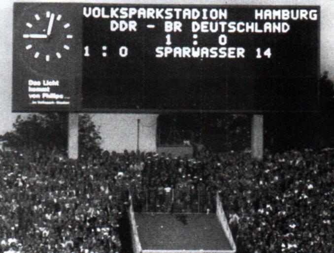 Вже на першій хвилині Шпарвассер ледь не розмочив Маєра. Фаворит миттєво зрозумів, що з НДР жарти погані та взяв гру в свої ноги. В наступні 15 хвилин ФРН змарнувала три стопроцентних нагоди. Навіть Мюллер з кількох метрів поцілив лише в штангу. На жаль, для діючих чемпіонів це був найкращий відрізок в матчі. В ідеальному механізмі щось зламалося і всі забули слова Кайзера, сказані перед поєдинком: «Пам’ятайте, що сьогодні ми граємо для Гельмута Шена». Однак тепер кожен грав сам за себе. Зокрема Франц, який хотів, щоб усі атаки йшли лише через нього. Нетцер, дивлячись на ці муки збірної, молився про те, щоб Шен не випустив його на поле. «Я розминався якомога далі від тренерської лави, щоб Гельмут не побачив мене, але трибуни, які почали вигукувати «Нетцер», нагадали йому про моє існування», – згадував Гюнтер. На 77-й хвилині Шпарвассер забив найвідоміший гол в історії східнонімецького футболу. Юрген не помітив Фогтса та Шварценбека, які завадили одне одному, а Маєр виконав якийсь дивний кульбіт, наче боявся дістати м’ячем в обличчя. Коли сфера опинилася в сітці, на гамбурзькому «Фолькспаркштадіоні» запанувала гробова тиша. Точніше, майже тиша, оскільки двохтисячний східний десант шаленів на трибунах.