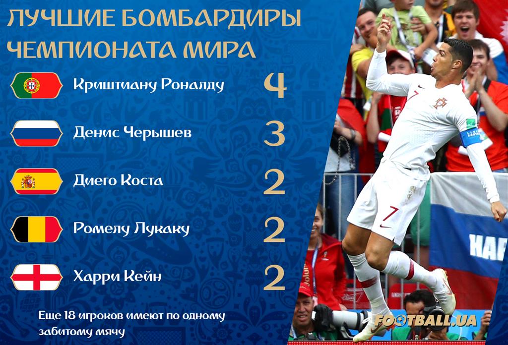 Таким образом, Криштиану с 4 забитыми мячами вышел в единоличные лидеры бомбардирской гонки ЧМ-2018, оторвавшись от россиянина Дениса Черышева, на счету которого 3 гола.