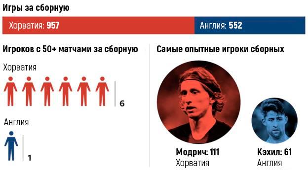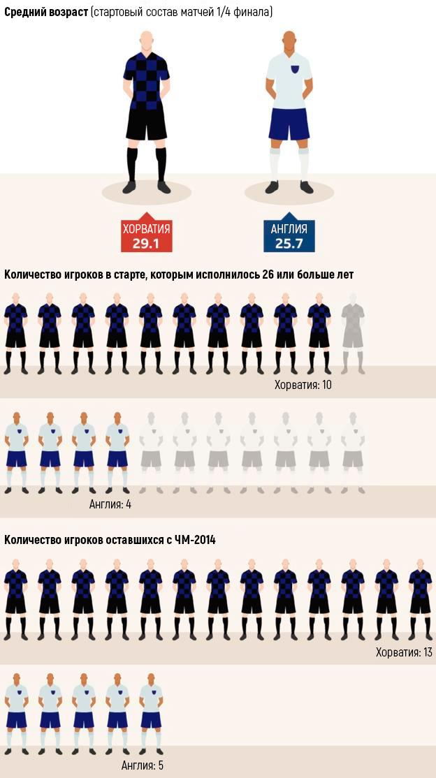 В составе англичан лишь три игрока старше 30 лет – Янг, Кэхилл и Джейми Варди. Из них лишь Янга можно считать основным игроком. Хорваты же полагаются на своих опытных игроков. 32-летний Модрич провел все матчи турнира от начала и до конца, а этот ЧМ для него стал уже четвертым.