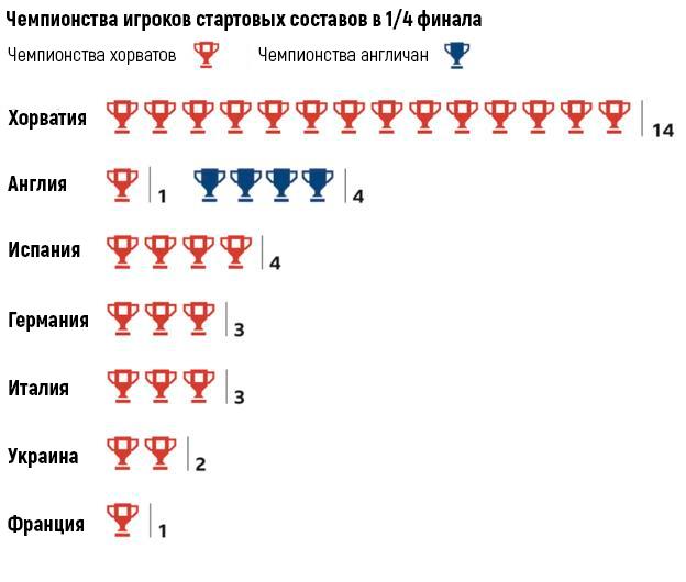 Не только в плане возраста и количества матчей у Хорватии опыта больше. В составе команды Златко Далича есть три игрока, принимавшие не последнюю участь в победе своих команд в Лиге чемпионов (Модрич – 4, Ракитич, Манджукич по разу, и это не учитывается Ковачич, который не был основным в Реале), а у Саутгейта сразу шесть парней побеждали в Кубке английской Лиги.