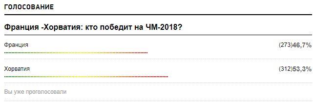 За хорватов отдали свои голоса 53,3% респондентов, а Францию поддержали лишь 46,7%.